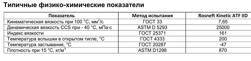 Роснефть Kinetic ATF IID проехало в испытуемом мною автомате 6Т30 порядка 3300 км, из них примерно половина трасса, остальное городские поездки, в основном короткие. Проблем ноль. Зима была не сильно холодная, в -25 и ниже испытать не довелось. Ну где то -15 было может немного. Кстати, это же масло сейчас залито в ГУР. Проблем нет.